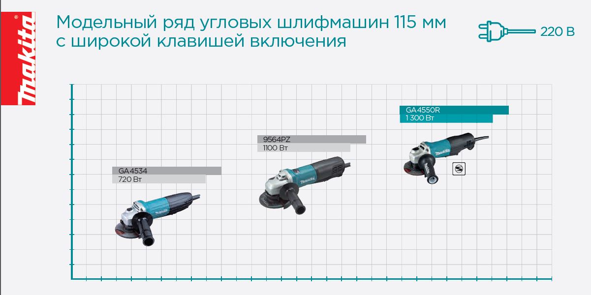 Сетевая «болгарка» - один из самых востребованных у потребителя инструментов. В линейке угловых шлифмашин Макита десятки таких моделей, и в 21-ом году 21 века компания расширила их ассортимент новой серией, в которой учтен большой опыт производства УШМ. Инструмент Makita GA4550R рассчитан на установку диска диаметром 115 мм и имеет повышенные мощность и скорость – 1,3 кВт и 11 тыс. об/мин. соответственно.
