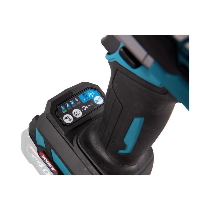 Переключатель реверса в гайковерте Makita TW001GM201 классический – в виде рычага с двух сторон верхней части рукоятки. Нейтральное положение используется для блокировки курка. В нижней части расположена панель управления с информативной индикацией. С помощью одной кнопки можно выбрать силу удара – отображение на панели. Это позволяет выбрать оптимальный режим применения, например, для контролируемой затяжки или с меньшим усилием, чтобы не повредить резьбу.