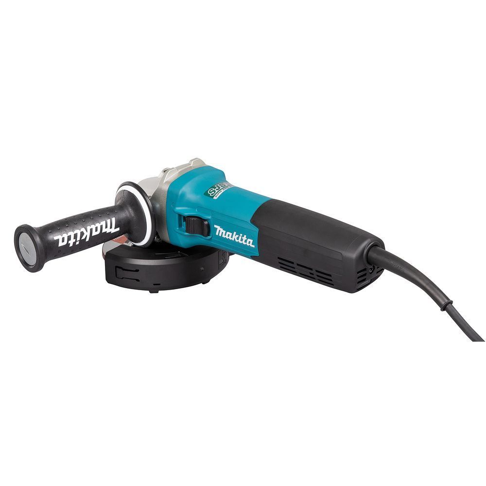 Электронная система контролирует и потребляемый приводом ток, а также  крутящий момент на валу. В этом случае  мощность автоматически снижается. Это существенно увеличивает ресурс агрегата. Ползунковый выключатель в болгарке Makita GA5092X01 можно использовать и в качестве кнопки, и с фиксацией для непрерывной работы. Его положение также контролируется электроникой, и при присоединении инструмента к сети в его включенном состоянии двигатель не запустится. Индикатор известит о некорректности миганием.