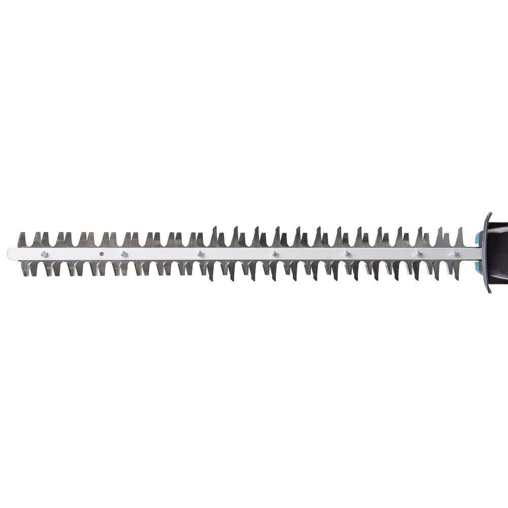 Весит кусторез Makita DUH606RT всего 2700 г, у него увеличена до 60 см длина ножа, и общая длина агрегата составляет 98,5 см. Привод вращается со скоростью 4 тыс.об/мин., а его энергоемкости достаточно для срезания поросли толщиной до 1 см (рекомендованное производителем значение) при максимальном диаметре реза 2 см. Для запуска необходимо предварительно переместить рычаг блокировки, что исключает случайное включение.