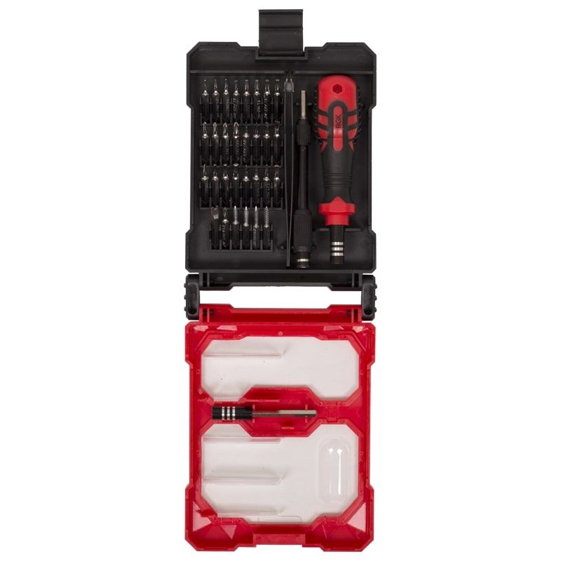 Отвертка RGK TB-34 поставляется с комплектом из 30 насадок различных типоразмеров. Они предназначены для обслуживания смартфонов, компьютерной техники, электроники и часовых механизмов.
