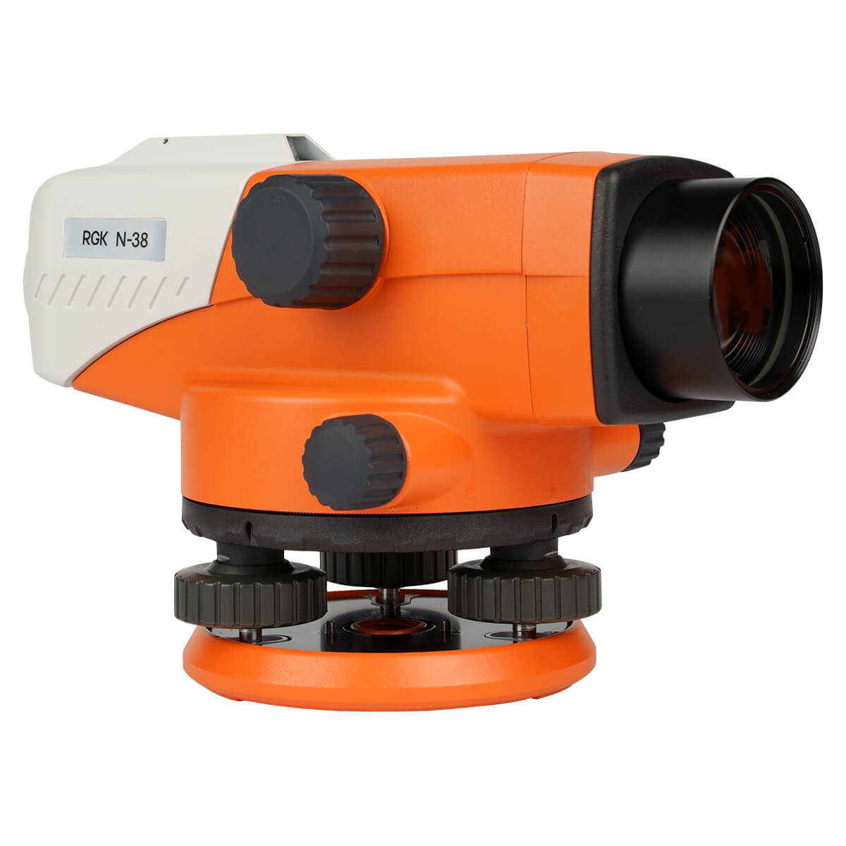 Высокая точность оптики нивелира усилена использованием компенсатора с магнитным демпфером. Система компенсации устраняет отклонение по горизонтали в пределах 15’ с точностью 0,2’, благодаря чему RGK N-38 обеспечивает стабильное изображение в зрительной трубе, а измерения сохраняют точность даже в сложных условиях работы. Для первоначальной установки нивелира в горизонтальное положение используются плавные наводящие винты, а контроль горизонта производится с помощью встроенного пузырькового уровня прибора.