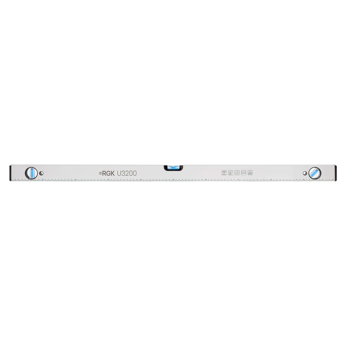 Прямоугольный корпус строительного уровня RGK U3200 изготовлен методом экструзии в формате из алюминиевого профиля толщиной 1 мм. За счет высокого качества исполнения и строгих допусков на производстве в качестве опорной поверхности можно использовать любую плоскость. Измерительная шкала с миллиметровыми делениями, начало отсчета которой совпадает с краем торцевой заглушки, может применяться для замеров и разметки, за счет чего специалист может брать с собой меньше инструментов.