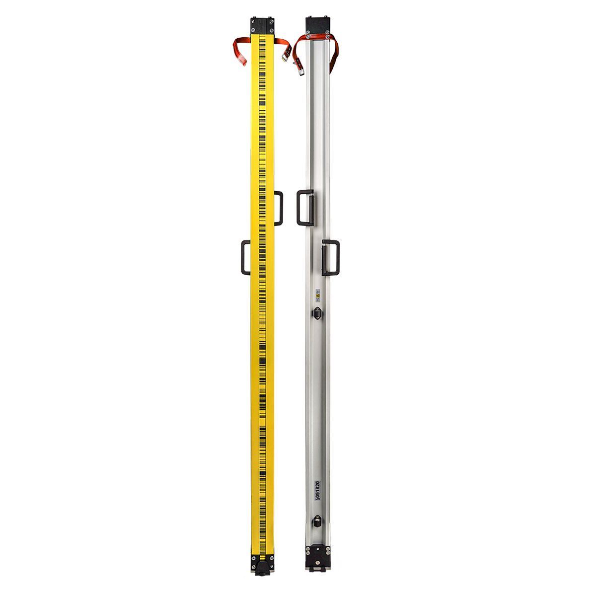 Входящие в комплект две неразъемные инварные рейки из алюминиевого профиля стандартно оснащены двумя круглыми уровнями, которые закреплены на разной высоте, и складывающимися ручками. Инварная вставка удерживается продольными элементами в соответствующем пазе лицевой части корпуса и пружиной, компенсирующей растяжение профиля. Пятки реек с износостойкой опорной пластиной, изготовленной из никелированной стали, снабжены специальными выступами, исключающими контакт лицевой части двух изделий при их укладке в транспортировочный бокс. Для их крепления между собой предусмотрены кожаные ременные стяжки, закрепленные в верхней части обоих инструментов.