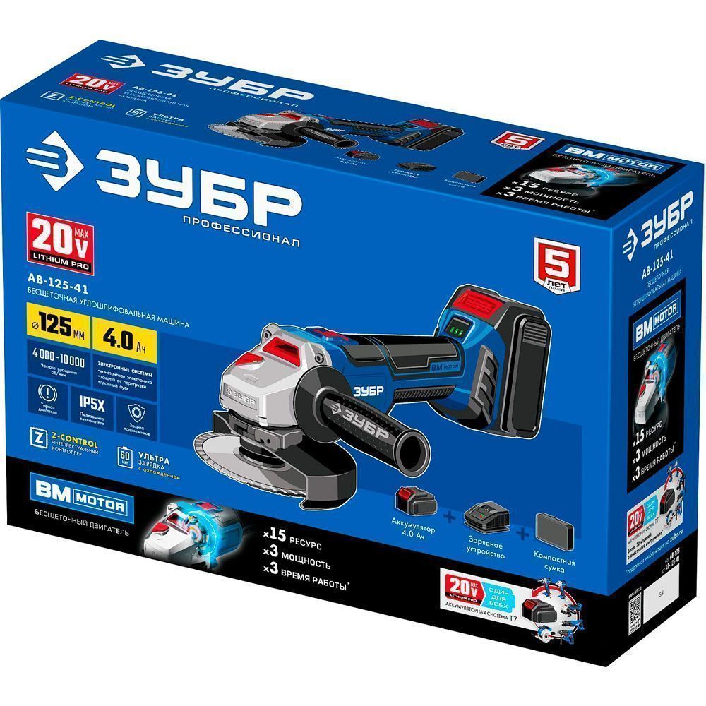 20В Т7, 125 мм, BM-Motor (бесщёточная), 1x4Ач, 4000 / 6000 / 8000 / 10000 об/мин, плавный пуск, защита от непреднамеренного запуска, поддержка оборотов, бесключевой кожух, суперфланец, тормоз вала, защита при заклинивании, сумка