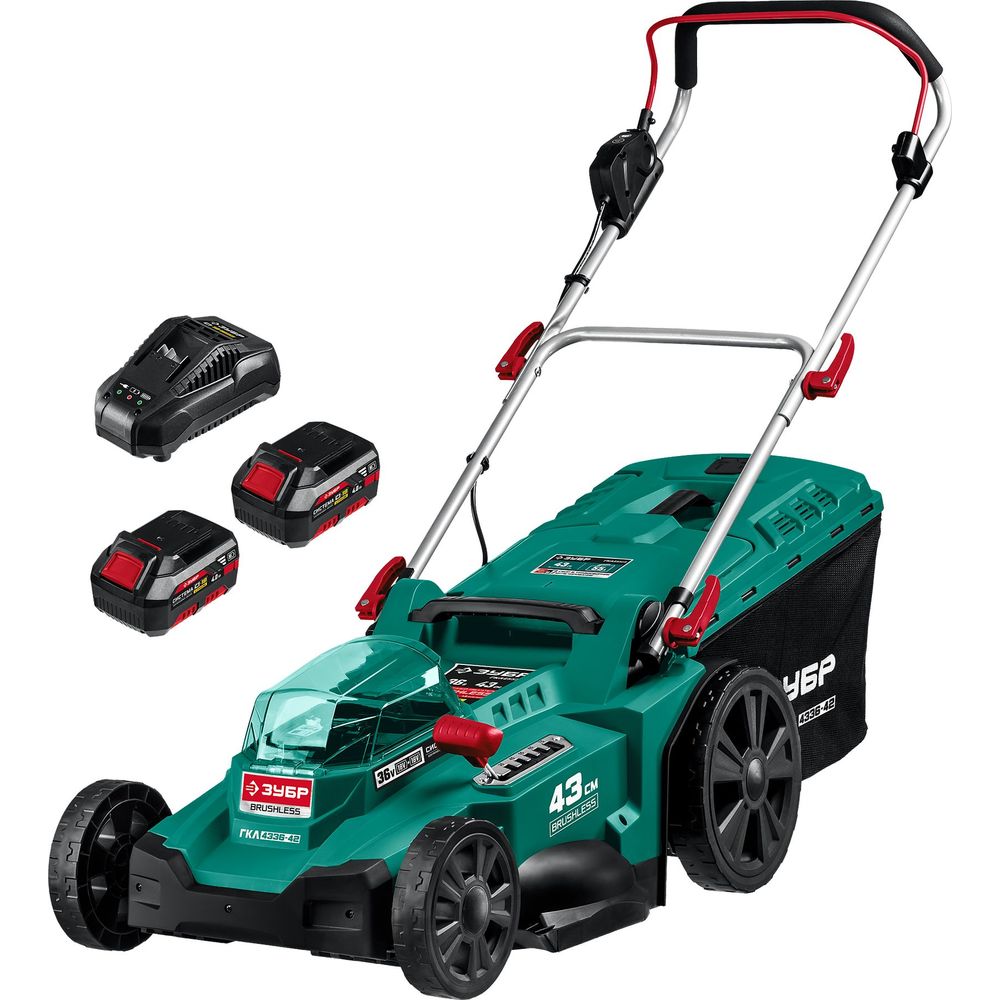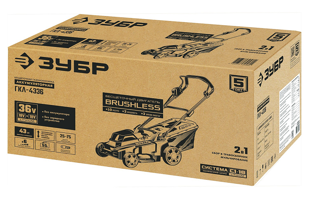 ЗУБР С1-18, 36В (2x18В), бесщеточная, 2x4Ач, 43 см, 25/75мм, 55л, мульчирование, коробка