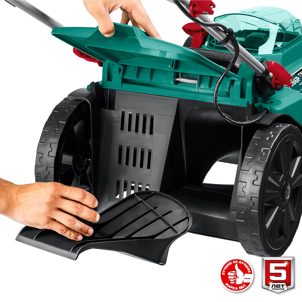 Травосборник позволяет поддерживать чистоту на обработанном участке и упрощает утилизацию травы, а удобный сигнализатор о заполнении вовремя даст понять, что травосборник пора опустошить