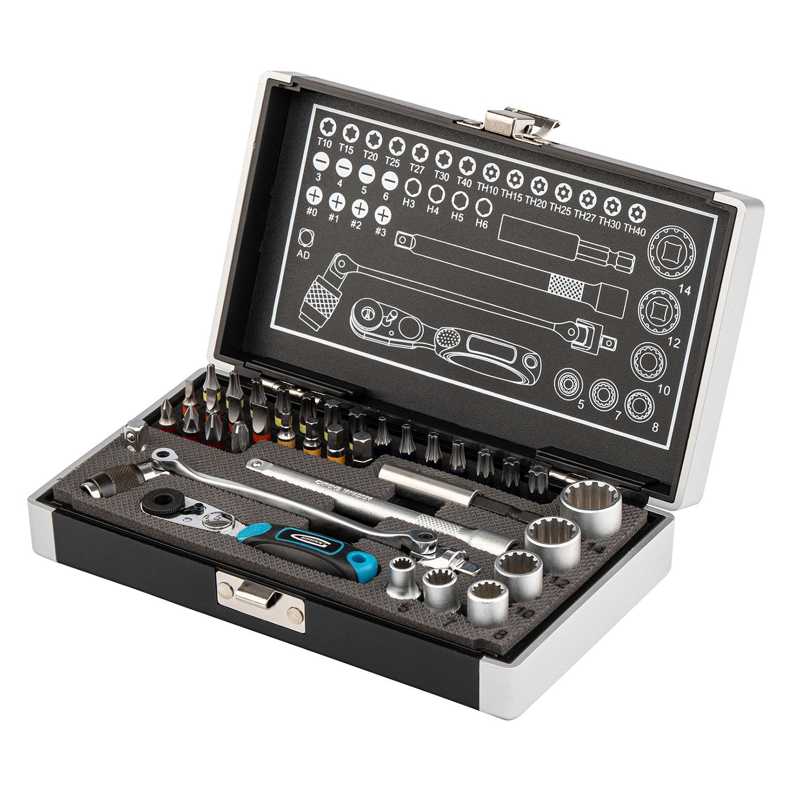 Набор Gross 11625 подходит для широкого спектра слесарно-монтажных работ, т.к. включает в себя 37 предметов из стали S2: трещотку, адаптер, карданный ключ, торцевые головки и биты с хвостовиком 1/4 дюйма. В комплекте биты следующих размеров: PH 0-3, Sl 3-6, TORX и ТТ 10, 15, 20, 25, 27, 30, 40, HEX 3-6, а также торцевые головки 5 мм, 7 мм, 8 мм, 10 мм, 12 мм, 14 мм. Набор используется для монтажа и демонтажа резьбовых крепежей. Пригодится во время сборки мебели, ремонта техники, а также дома или в гараже.