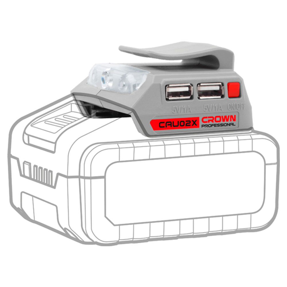Зарядное устройство CAU02X (адаптер питания) — это практичный переходник для аккумуляторов CROWN серии 20VMax B3+, который создает из вашего аккумулятора внешний источник зарядки для мобильных телефонов и других носимых устройств, а так же имеет функцию фонаря. Два USB-порта дают возможность заряжать сразу два устройства одновременно.