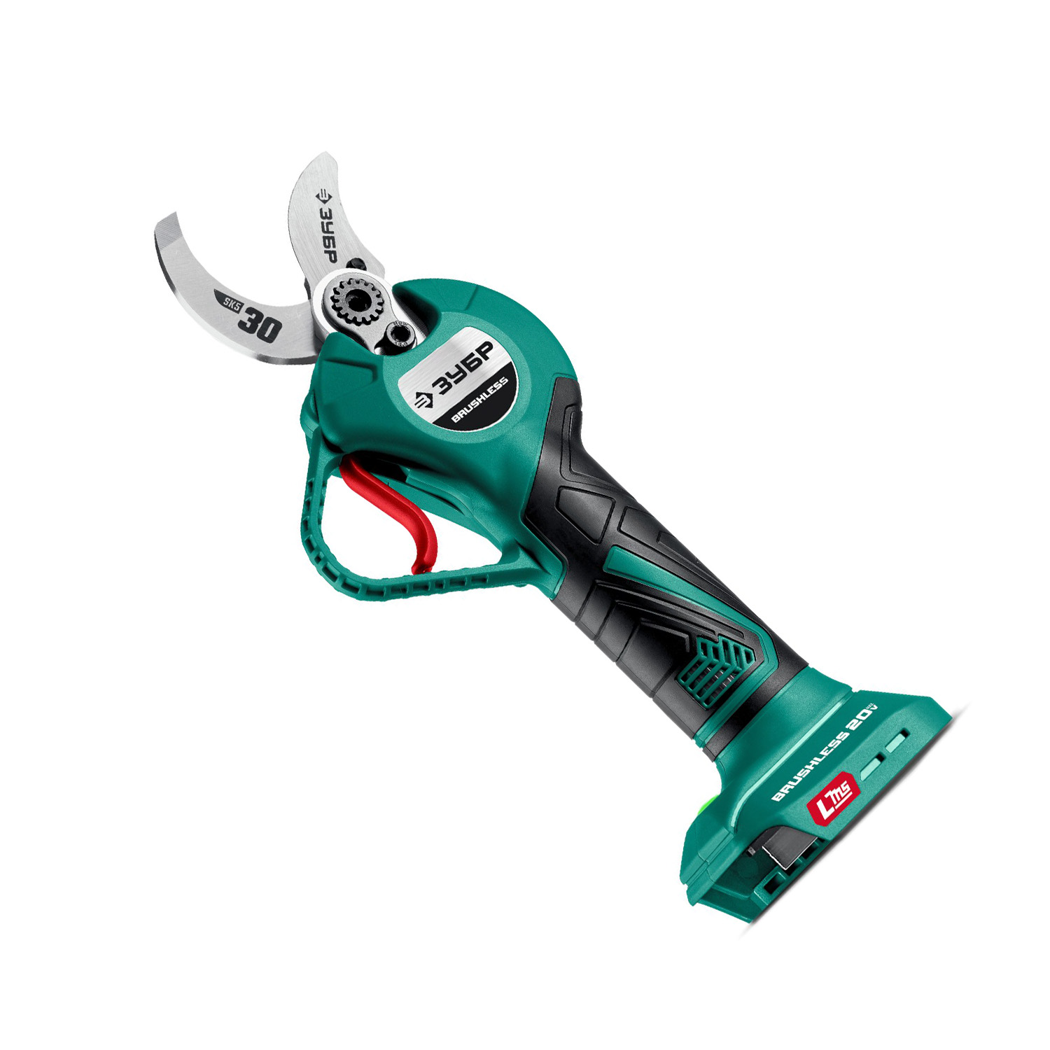 Аккумуляторный секатор ЗУБР - удобный инструмент для срезания веток кустарников и деревьев. Большая ширина захвата с возможностью настройки, мощный бесщеточный двигатель и сверхострое режущее лезвие из сплава SK5, позволяют производить ровный срез не прилагая излишних усилий.