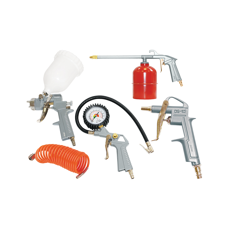 Набор профессионала: краскопульт с верхним бачком, пневмопистолет для продувки, краскопульт для вязких жидкостей, пневмопистолет для накачки шин, спиральный шланг.