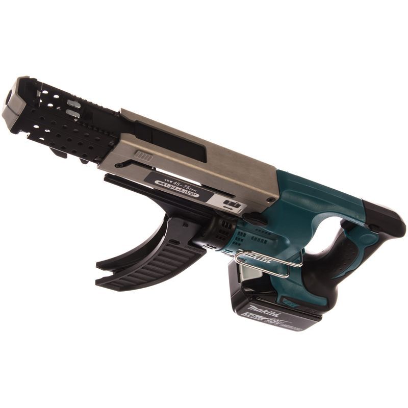 Брутальный вид этого агрегата навевает аналогию с известным стрелковым оружием, однако у шуруповерта Makita DFR750RFE в таком условном сравнении есть существенное преимущество. Он способен работать с «патронами» разного калибра – то есть с шурупами семи стандартных значений длины – от 45 мм до 75 мм. Как и положено шуруповерту, он может их не только закручивать, но и откручивать – для этого имеется реверсивный переключатель. А с автоматическим оружием его роднит возможность съёма магазина, точней, направляющей для шурупов. Она складная, поэтому при хранении эта автоматическая отвертка не займёт много места.