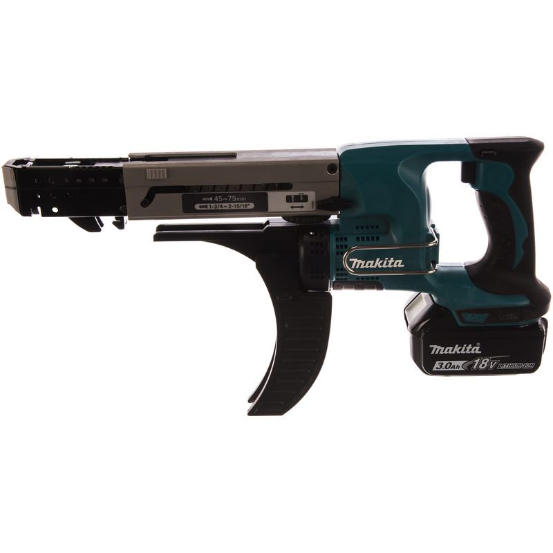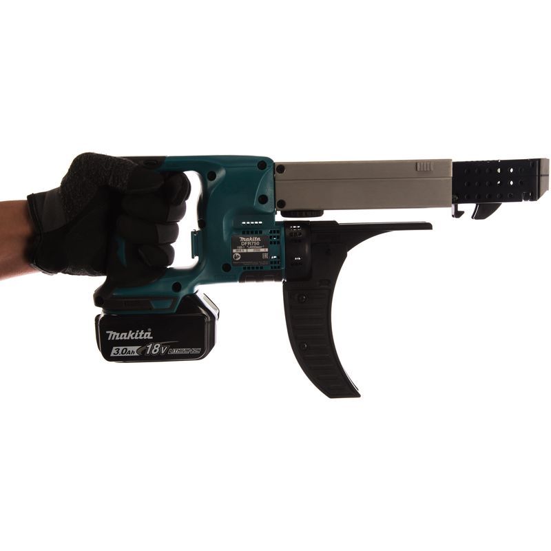 Особое внимание в шуруповерте Makita DFR750RFE уделено точной фиксации и позиционированию шурупов. Конструкция подающей головки сделана таким образом, что шуруп имеет только одну степень свободы – вперёд. Разбалтывание исключено, а само перемещение осуществляется плавно.