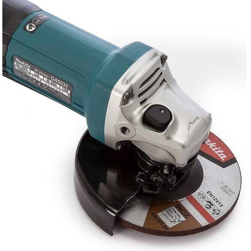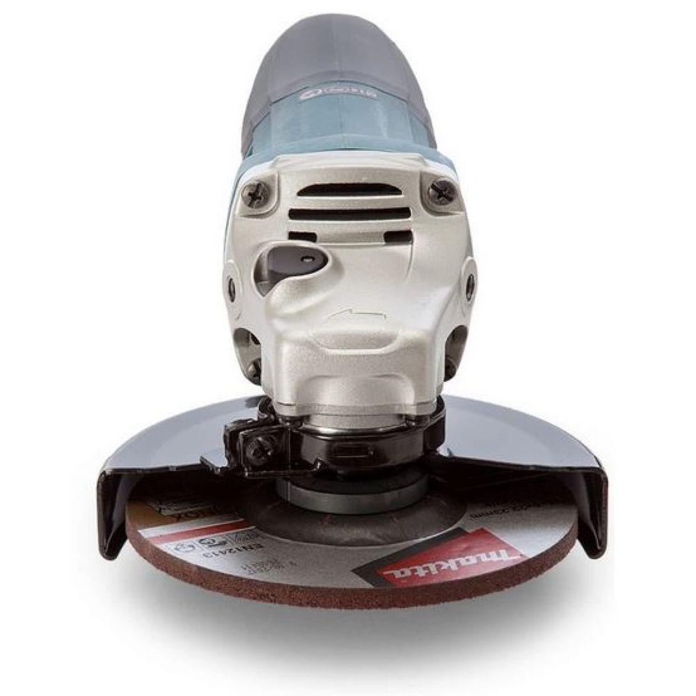 Это помимо того, что Makita GA4534 способна резать на 2,5 мм глубже, нежели её предшественницы. Впрочем, связано это с конструктивным отличием. Работает этот агрегат от сети 220 В и двигателя мощностью в 0,72 кВт вполне хватает для отрезания диском в 115 мм любых, самых твёрдых материалов. Шпиндель – стандартный, М14х2. Резание производится на фиксированной скорости 11 тыс. об/мин., причём без рывков, в том числе и при пуске. За это отвечает специальный механизм сцепления (Super Joint System) с муфтой.