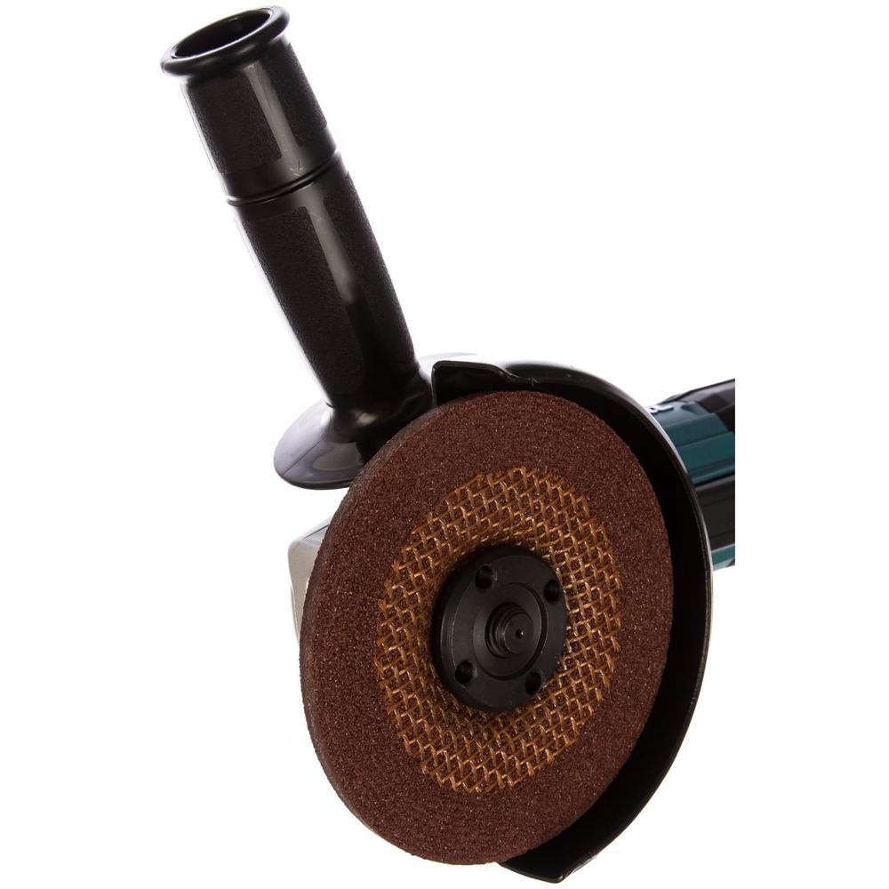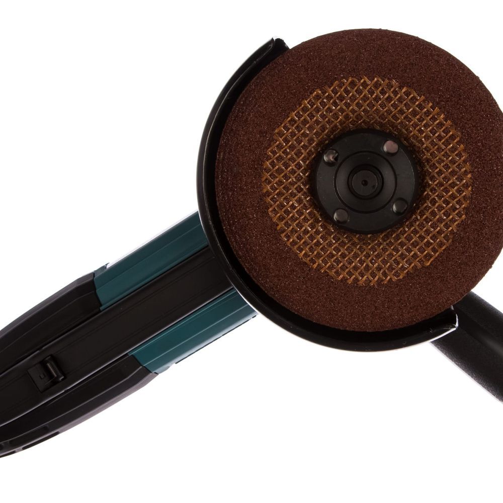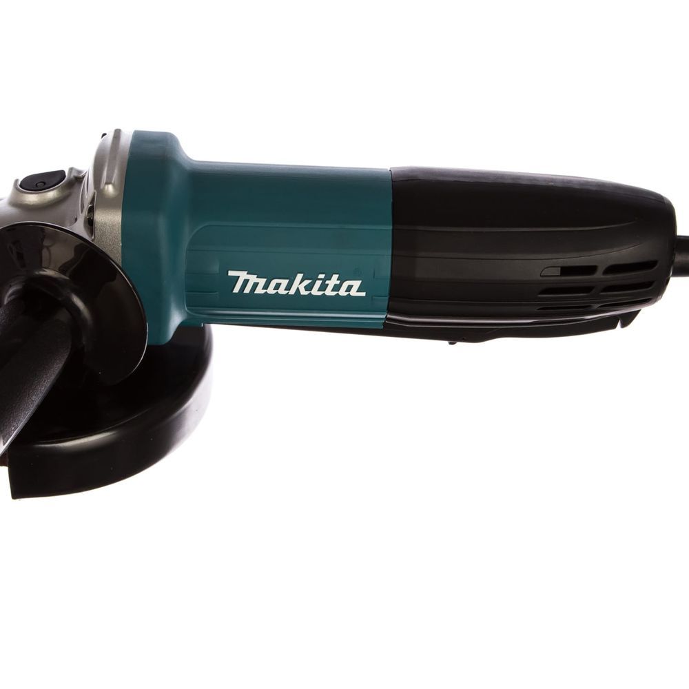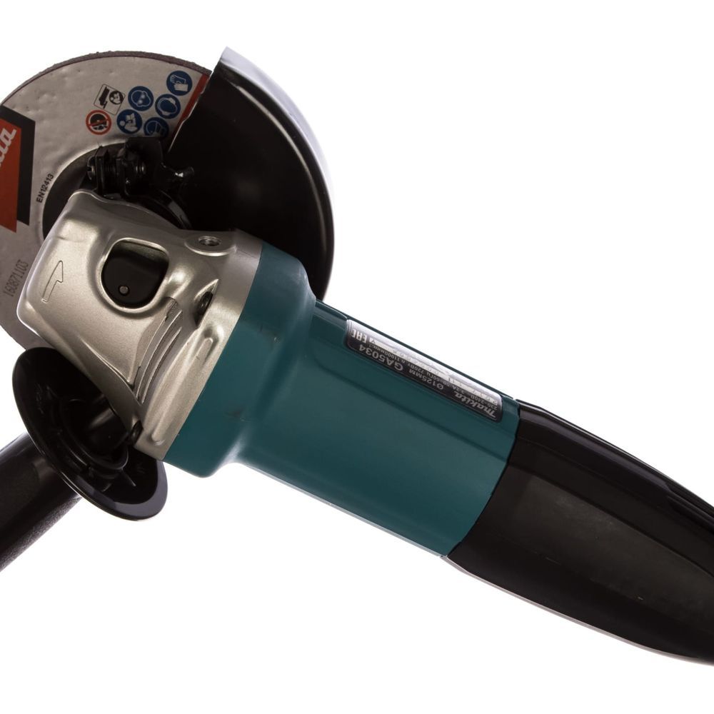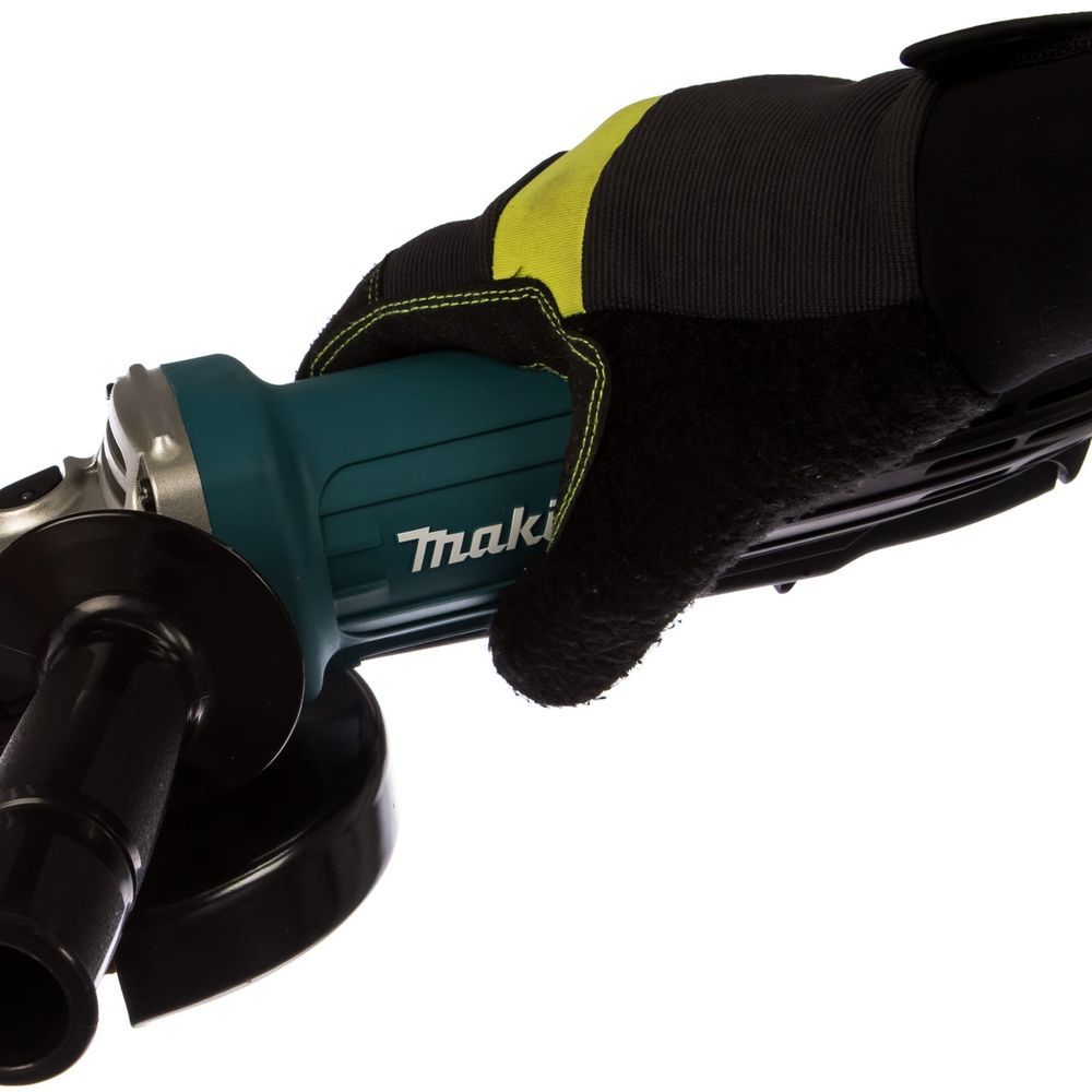 Сама рукоятка у инструмента Makita GA5034 покрыта антивибрационным материалом, а её размер в сочетании с размерами, формой и покрытием задней части основного корпуса идеально подобраны для удобного захвата. Макитовская эргономика здесь явно на высоте. Но это ешё не всё. Клавишный выключатель на корпусе этой шлифмашины расположен таким образом, что им можно управлять во время работы одной рукой. Разумеется, имеется и кнопка блокировки от случайного пуска.