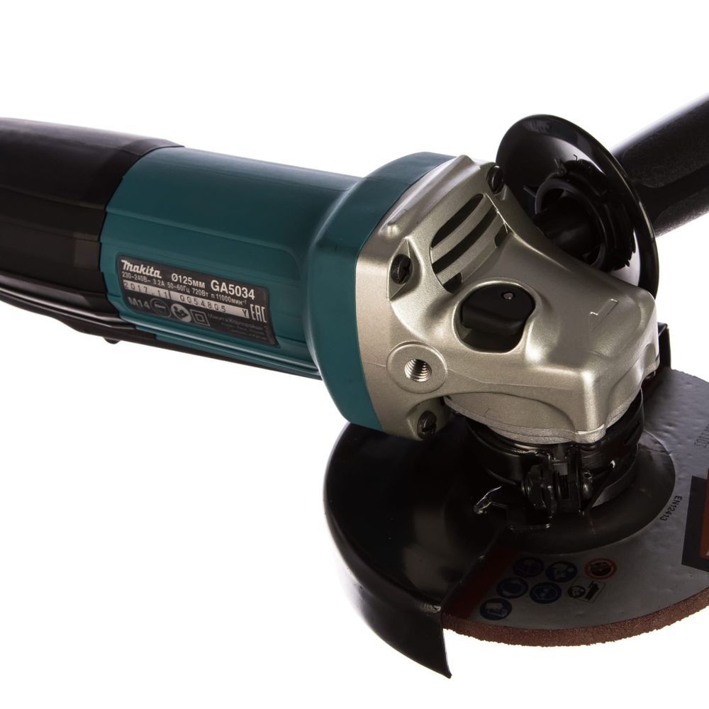 Это помимо того, что Makita GA5034 способна резать на 2,5 мм глубже, нежели её предшественницы. Впрочем, связано это с конструктивным отличием. Работает этот агрегат от сети 220 В и двигателя мощностью в 0,72 кВт вполне хватает для отрезания диском в 125 мм любых, самых твёрдых материалов. Шпиндель – стандартный, М14х2. Резание производится на фиксированной скорости 11 тыс. об/мин., причём без рывков, в том числе и при пуске. За это отвечает специальный механизм сцепления (Super Joint System) с муфтой.
