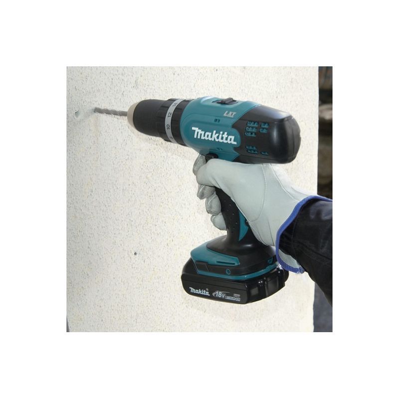 Такие возможности дрели Makita DHP453SYE обусловлены электроприводом с повышенным напряжением питания. Литиево-ионнный аккумуляторный блок в компактном слайдерном исполнении выдаёт напряжение 18 В и имеет ёмкость 1.3 А-час. К слову, в комплекте поставки дрели этих блоков два.