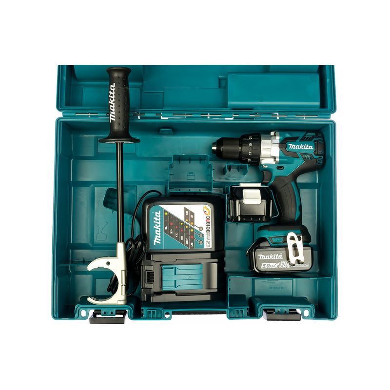Штатный аккумуляторный блок на литиевой батарее рассчитан на напряжение 18 В и имеет ёмкость 3 А-час, однако может быть заменён на более электроёмкий, вплоть до 5 А-час. В комплекте поставки традиционно два аккумуляторных блока, уровень разряда которых отображается на Makita DDF481RTE встроенным индикатором. Зарядка не займёт много времени, потому что зарядное устройство, находящееся в кейсе этого электроинструмента – типа Quick Charger.