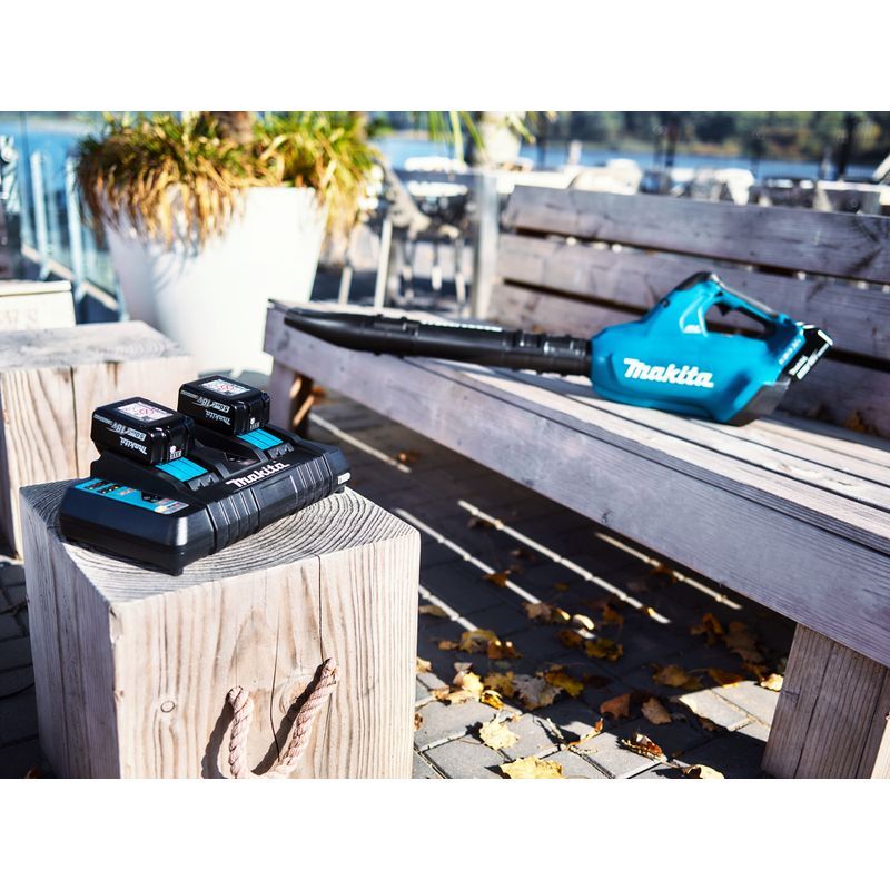 Такие возможности воздуходувки Makita DUB362Z  обусловлены двумя факторами. Во-первых, это использование литиево-ионных аккумуляторов значительной емкости и с повышенным напряжением. В агрегат можно установить слайдерные блоки производства Макита  на 18 В и емкостью от 1,5 А-час до 5 А-час. Во-вторых, в воздуходувку устанавливается пара таких блоков, так что напряжение питание привода составляет 36 В.