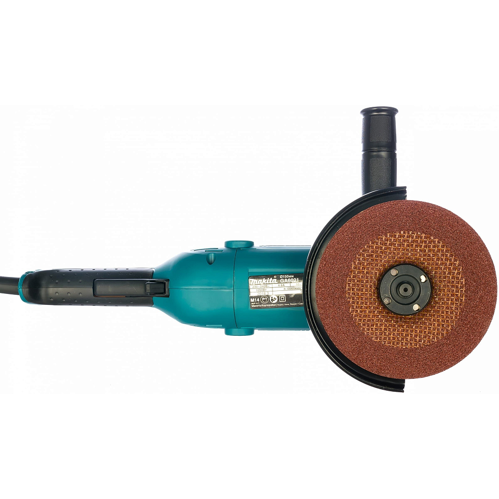 Компоновка шлифмашины Makita GA6021 традиционна для инструмента этого класса, можно только дополнительно отметить прекрасную сбалансированность габаритов (длина – 39 см) и веса – его значение 2.3 кг. Дополнительную рукоятку можно закрепить с любой удобной стороны. Она входит в комплект поставки, как и весь необходимый для установки диска крепёж и инструмент, а также защитный кожух. Кстати, его перестановка вообще не требует никакого инструмента.