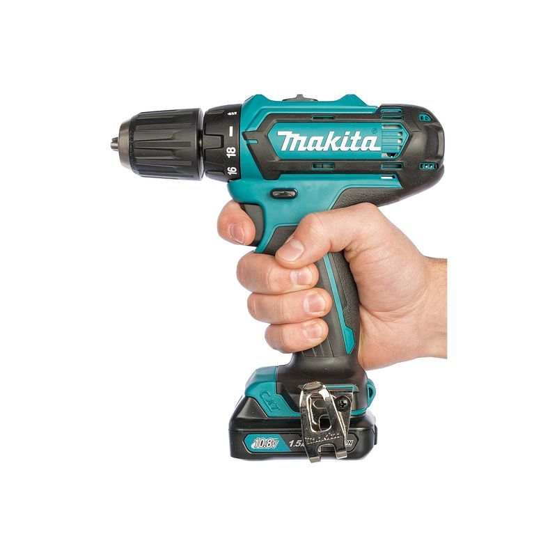 От этого зависит и полный вес дрели-шуруповерта Makita DF331DWYE, находящегося в диапазоне от 1100 до 1300 грамм. При длине всего 18,9 см этот инструмент кажется миниатюрным, несмотря на приличные возможности, описанные выше. В инструкции по эксплуатации показано, как легко этот агрегат переносится на поясном ремне. Для этого в дрели имеется съемный крючок, который можно установить с любой стороны.