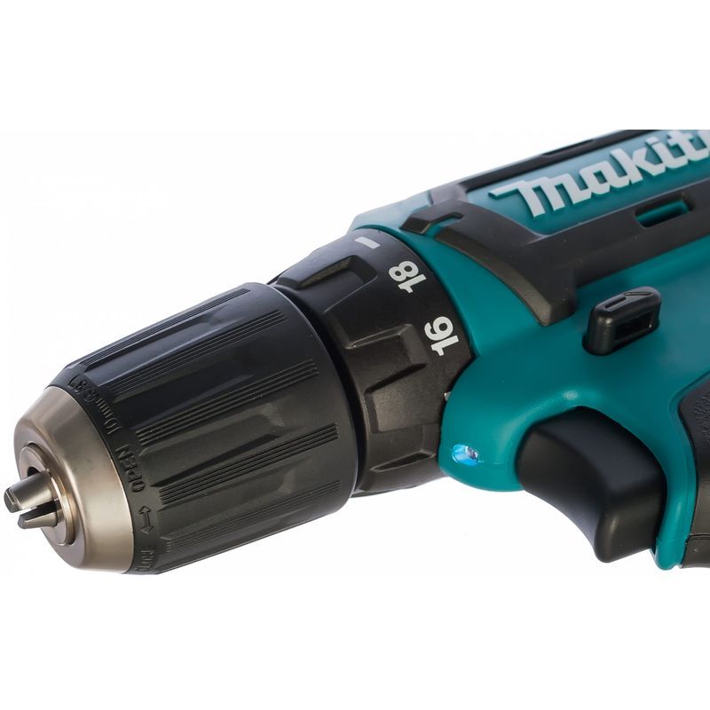 Его применение в дрели-шуруповерте Makita DF331DWYE позволяет заменять биту или сверло очень быстро и одной рукой. Диаметр патрона 10 мм, такой же максимальный диаметр отверстия при сверлении в металле. В дереве это значение ограничено величиной 21 мм, а максимальную скорость с учетом твердости материала в этом инструменте можно изменять двухпозиционным переключателем, размещенным в верхней части корпуса. Её значения – 350 или 1300 об/мин.