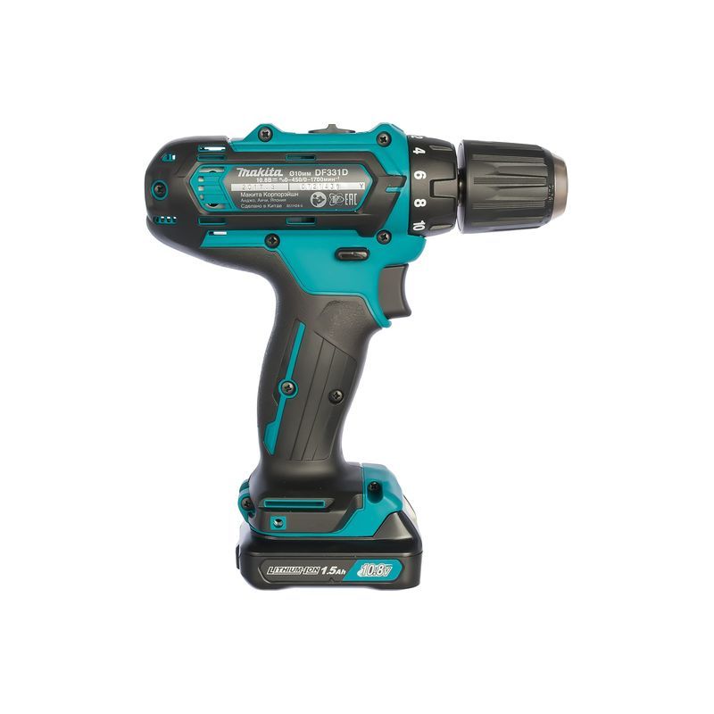 Электропитание дрели  Makita DF331DWYE осуществляется от литиево-ионного аккумуляторного блока слайдерного типа напряжением 10,8 В. Это новая модель аккумуляторов серии BL10XX производства Макита, и она оснащена четырехпозиционным индикатором разряда. Емкость, в зависимости от модификации, находится в диапазоне от 1,5 до 4 А-час.