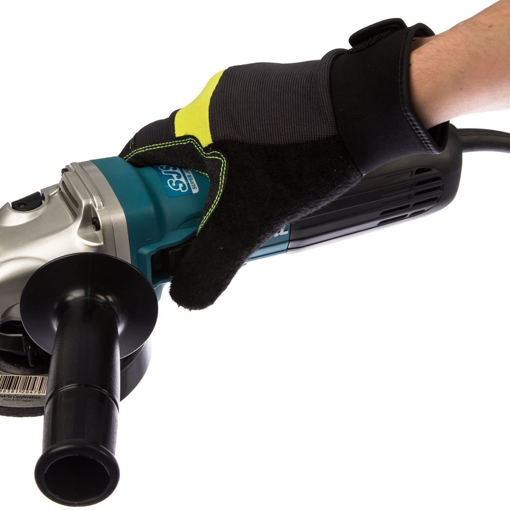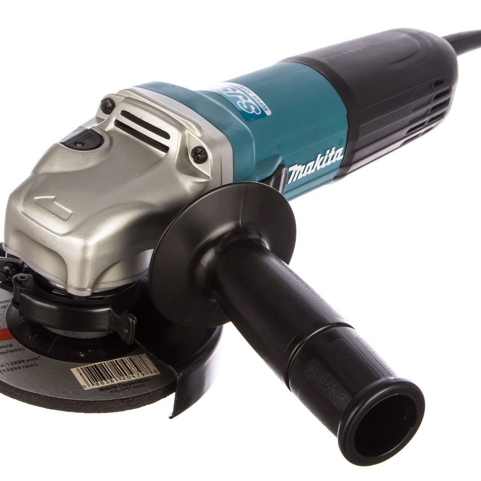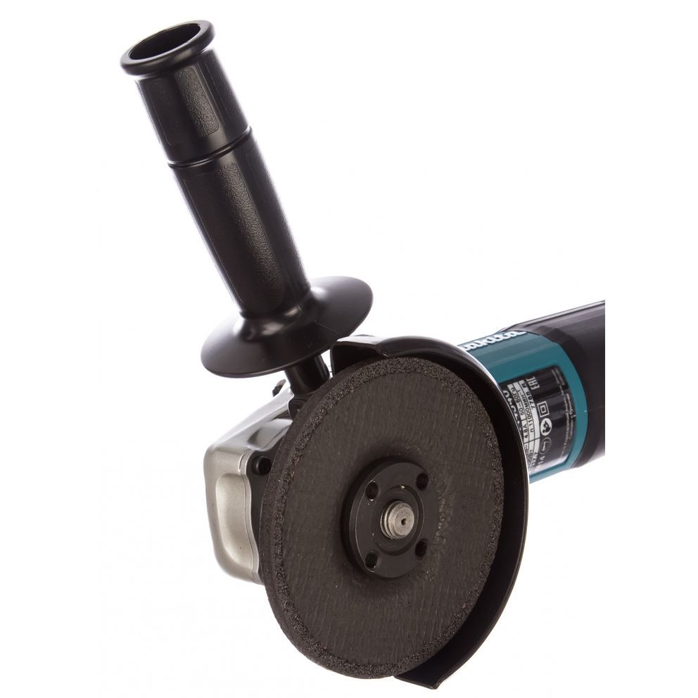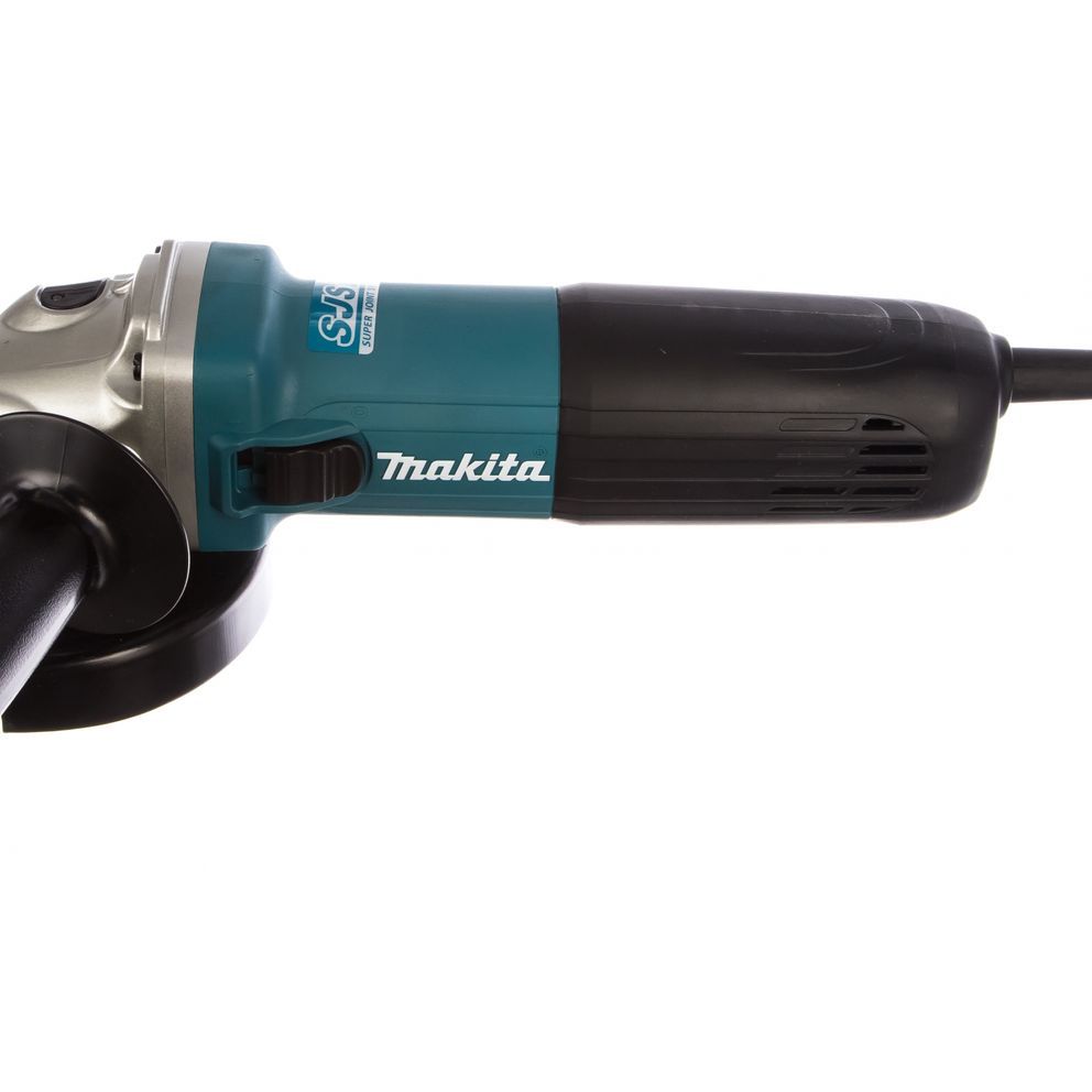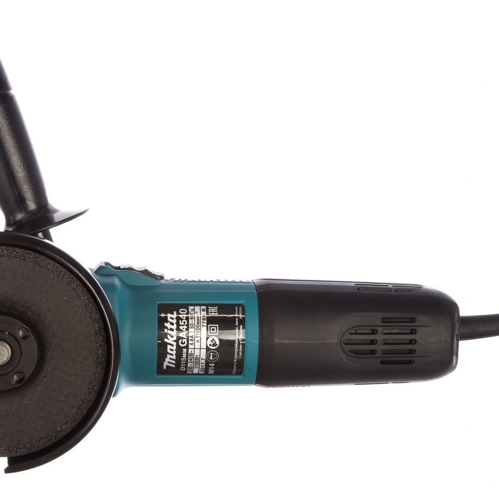 Шлифмашина Makita GA4540 оснащается двигателем мощностью 1,1 кВт, работающим на скорости 11000 об/мин. Управление осуществляется одним ползунковым переключателем, расположенным в боковой передней части. Основной его режим – без фиксации, но при необходимости пользователь может перевести движок в фиксированное включенное положение. Вся электрика агрегата имеет двойную изоляцию, поэтому включать болгарку можно в обычную розетку. Длина шнура – 2,5 метра.