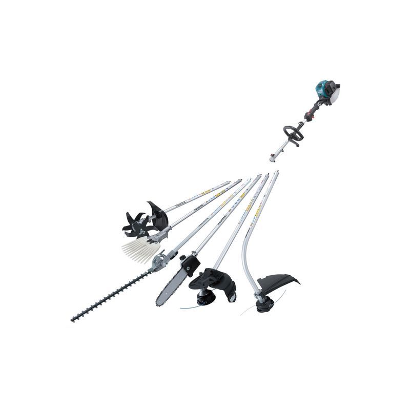 По внешнему виду этот агрегат больше похож на мотокосу, чем на изделие, обычно называемое у нас «мотоблоком». Фактически Makita EX2650LH – это многофункциональный привод, который можно использовать в разных целях при работах в саду. Компания Макита на основе значительного опыта производства садового инструмента, решила в 2017 году предложить потребителям агрегат, который с помощью насадок превращается в мотокосу и кусторез для насаждений любой высоты, или в культиватор. Можно им формировать и кромки живой изгороди, а для южных стран предлагается даже насадка для сбора кофе.