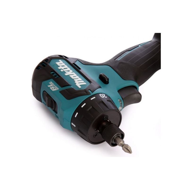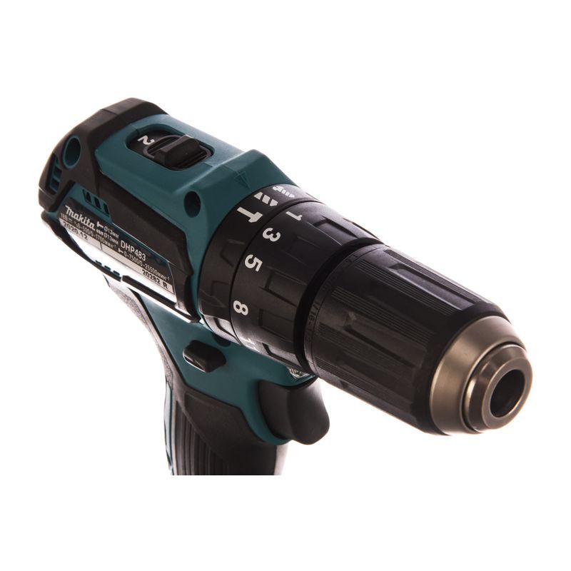 За патроном располагается кольцо настройки крутящего момента – его можно уменьшить до 23 Нм, используя 16 положений регулятора. Переключатель режима в дрели-шууповерте  Makita DHP483Z отдельный, расположен за кольцом настройки момента. Следующий элемент управления в верхней части инструмента – переключатель максимальной скорости. Она может ограничиваться величиной 500 или 1700 об/мин., для ударного режима – 7500 или 25500 уд/мин.