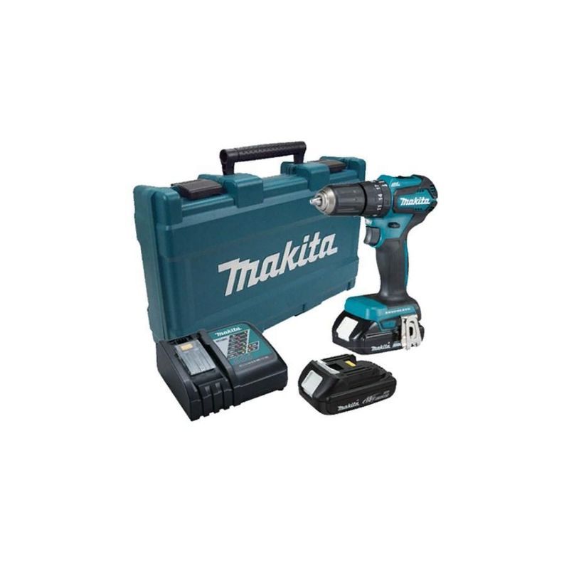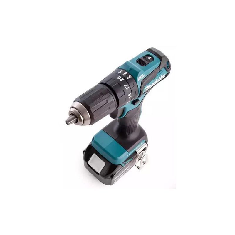 Преимуществом инструмента Makita DHP483SYE является его комплектация, в которую входит 2 аккумулятора, зарядное устройство и кейс. Слайдер с выходным напряжением 18 В, на использование которого рассчитан описываемый агрегат, может иметь разную емкость – от 1,5 до 6 А-час и обеспечивает приводу максимальный крутящий момент 40 Нм.