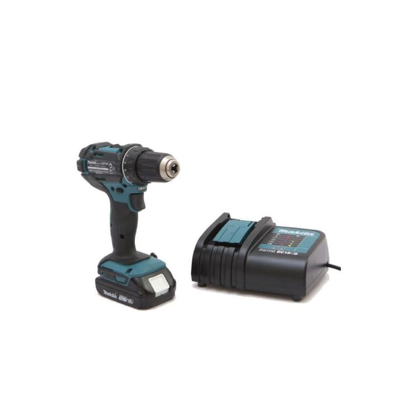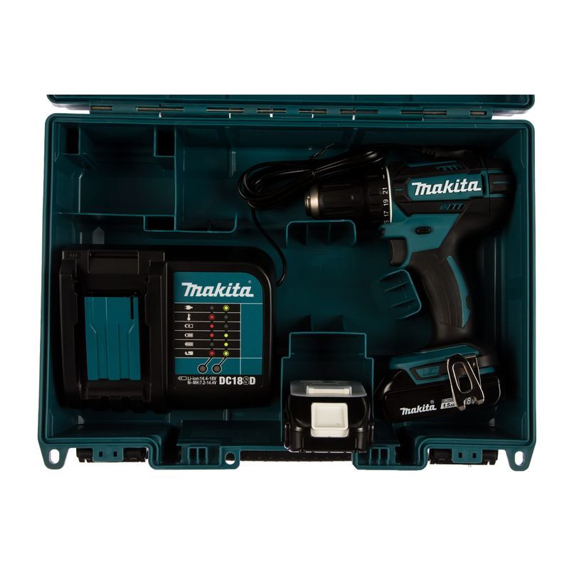 В комплект поставки дрели-шуруповерта Makita DDF482SYE входит 2 аккумулятора и зарядное устройство. В инструмент можно установить блоки указанной серии  емкостью от 1,5 до 6 А-час. Это немного повлияет на массу агрегата – он может весить 1,5 или 1,7 кг при длине 18,5 см.