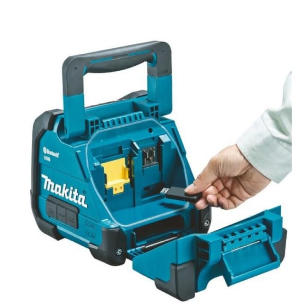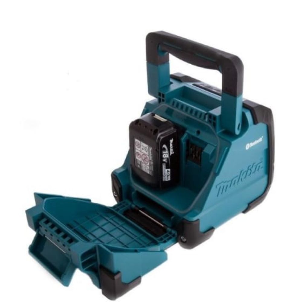 На верхней панели колонки Makita DMR202 размещены стандартные кнопки воспроизведения, паузы и перемотки. Управление громкостью тоже кнопочное, и имеется индикация о подключении внешних устройств и разряде батареи. В нижней задней части компактно расположены разъемы для присоединения USB, AUX и разъем питания. Посадочные гнезда для аккумулятора рассчитано на установку блоков разного размера, но за исключением батарей серии G.