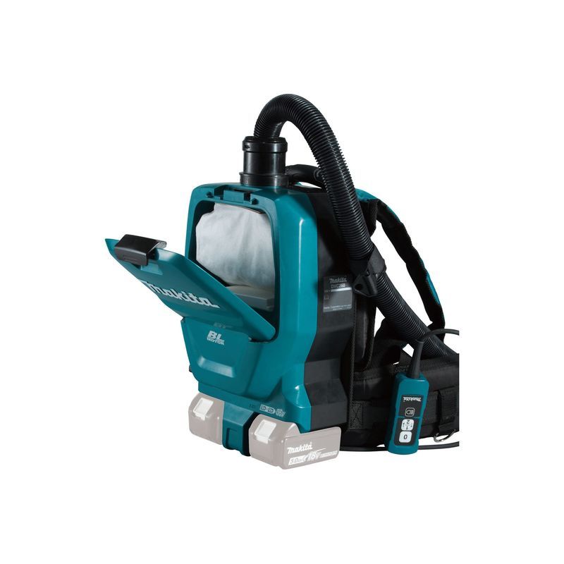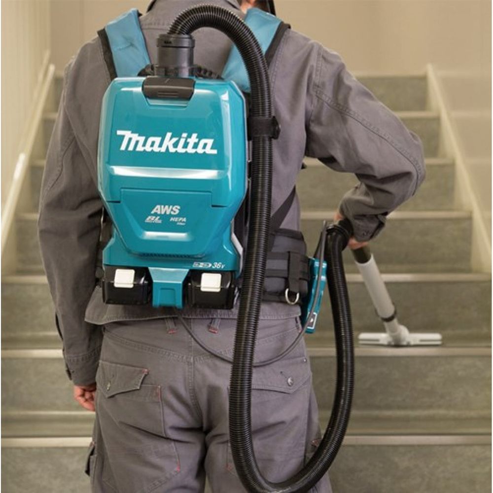 Автономный мощный пылесос-ранец для коммерческого применения с насадками и возможностью пылеудаления в инструменте с беспроводным включением. Аккумуляторы - 2 шт. BL18XX, в комплект поставки не входят. Вес 3,9 ... 4,3 кг, толщина 152 мм.