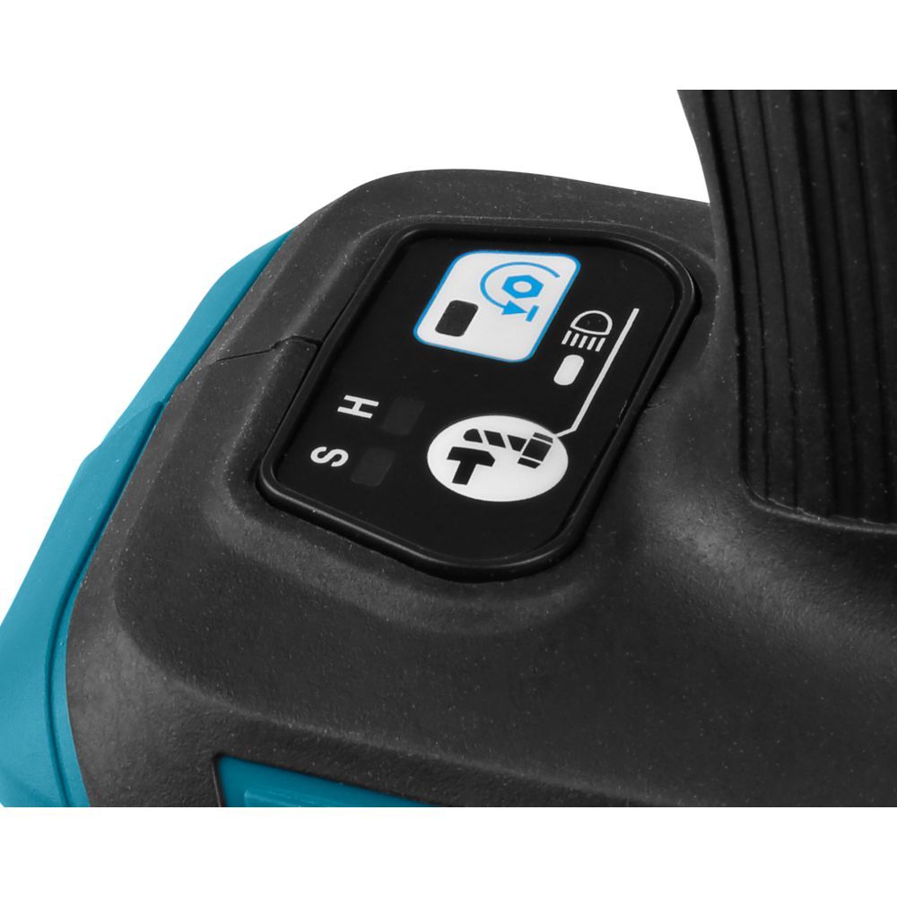 Ещё одно нажатие на кнопку переведет гайковерт Makita DTW181Z в режим автоматического останова при выкручивании. Скорость здесь максимальная, но переключатель реверса при этом должен быть установлен в положение, соответствующее вращению против часовой стрелки. Переключатель здесь традиционный – в виде рычага с двух сторон рукоятки. В нейтральном положении он блокирует работу курка, при увеличении давления на который скорость возрастает от нуля. Японские разработчики инструмента добавили ещё одну интересную функцию - если нажимать на курок дольше 6 минут, привод отключится автоматически.