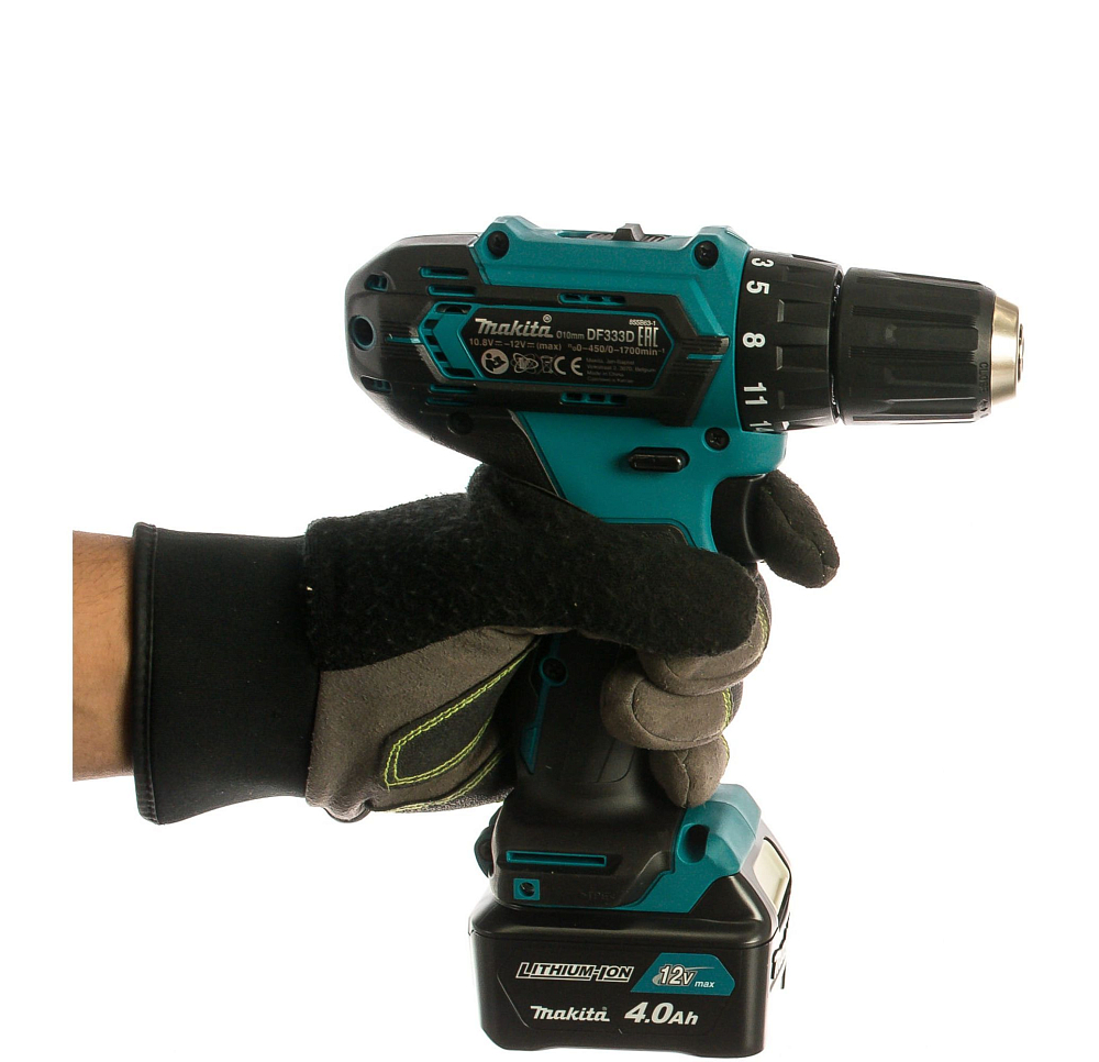 Элементы управления дрелью-шуруповертом Makita DF333DWME традиционные. Курок-выключатель, при увеличении давления на который возрастает скорость от нуля до максимума. Её величина устанавливается механическим переключателем в верхней части корпуса. Выбраны значения под работу с материалом разной твердости – 450 или 1700 об/мин.